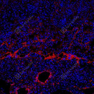 | IF检测GSDME蛋白(货号 GB150167)(红色). 样品: 小鼠胎盘, 4%多聚甲醛 (货号G1101) 固定12-24小时. 抗原修复: 抗原修复仪(货号 ARI-4), Tris-EDTA抗原修复液(pH 9.0) (货号G1203), 水浴100℃, 25分钟. 封闭: 3% BSA(货号GC305010)的PBS溶液, 室温孵育30分钟. —抗: 1: 1000稀释, 4℃ 孵育过夜. 二抗: Cy3标记山羊抗兔IgG (H+L) (货号GB21303), 1: 300稀释, 室温孵育1小时. |
