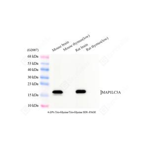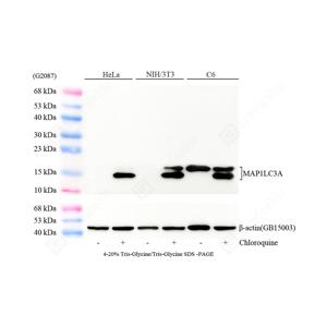 | WB检测LC3A蛋白(货号 GB150107). 样品: 经RIPA裂解液(货号G2002)处理的蛋白质. 封闭: 3%脱脂牛奶(货号GC310001)溶于TBST溶液, 室温孵育1小时. —抗: 1: 1000稀释, 4℃ 孵育过夜. 二抗: HRP标记山羊抗兔IgG (H+L) (货号GB23303), 1: 5000稀释, 室温孵育1小时. |