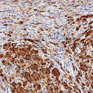 | IHC检测Melanoma gp100蛋白(货号 GB150160). 样品: 人黑色素瘤, 4%多聚甲醛 (货号G1101) 固定12-24小时. 抗原修复: 抗原修复仪 (货号 ARI-4),Tris-EDTA抗原修复液(pH 9.0) (货号G1203), 水浴100℃, 25分钟. —抗: 1: 1000稀释, 4℃ 孵育过夜. 二抗: S-vision免疫组化多聚二抗(山羊抗小鼠), 即用型(货号G1301), 室温孵育20分钟. |