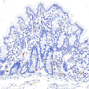 | IHC检测S100A8蛋白(货号 GB150194). 样品: 人结肠, 4%多聚甲醛 (货号G1101) 固定12-24小时. 抗原修复: 抗原修复仪(货号 ARI-4),Tris-EDTA抗原修复液(pH 9.0) (货号G1203), 水浴100℃, 25分钟. —抗: 1: 1000稀释, 4℃ 孵育过夜. 二抗: S-vision免疫组化多聚二抗(山羊抗兔),即用型 (货号G1302), 室温孵育20分钟. |