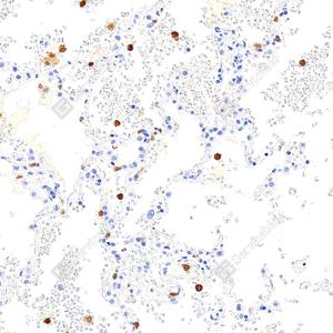 | IHC检测S100A8蛋白(货号 GB150194). 样品: 人肺, 4%多聚甲醛 (货号G1101) 固定12-24小时. 抗原修复: 抗原修复仪(货号 ARI-4),Tris-EDTA抗原修复液(pH 9.0) (货号G1203), 水浴100℃, 25分钟. —抗: 1: 1000稀释, 4℃ 孵育过夜. 二抗: S-vision免疫组化多聚二抗(山羊抗兔),即用型 (货号G1302), 室温孵育20分钟. |