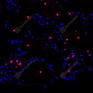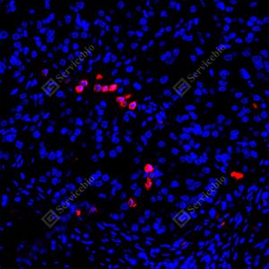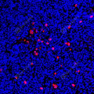 | IF检测S100A8蛋白(货号 GB150194)(红色). 样品: 人扁桃体, 4%多聚甲醛 (货号G1101) 固定12-24小时. 抗原修复: 抗原修复仪(货号 ARI-4),Tris-EDTA抗原修复液(pH 9.0) (货号G1203), 水浴100℃, 25分钟. 封闭: 3% BSA(货号GC305010)的PBS溶液, 室温孵育30分钟. —抗: 1: 1000稀释, 4℃ 孵育过夜. 二抗: Cy3标记山羊抗兔IgG (H+L) (货号GB21303), 1: 300稀释, 室温孵育1小时. |