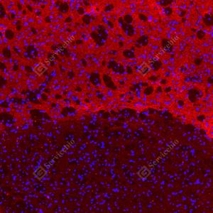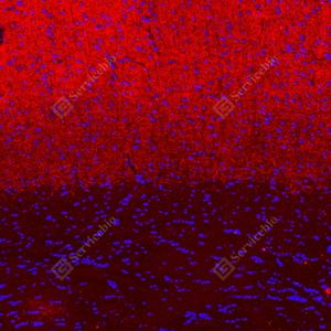 | IF检测TrkA蛋白(货号 GB150170)(红色). 样品: 小鼠脑, 4%多聚甲醛 (货号G1101) 固定12-24小时. 抗原修复: 抗原修复仪(货号 ARI-4),Tris-EDTA抗原修复液(pH 9.0) (货号G1203), 水浴100℃, 25分钟. 封闭: 3% BSA(货号GC305010)的PBS溶液, 室温孵育30分钟. —抗: 1: 150稀释, 4℃ 孵育过夜. 二抗: Cy3标记山羊抗兔IgG (H+L) (货号GB21303), 1: 300稀释, 室温孵育1小时. |