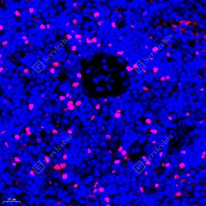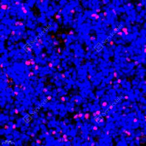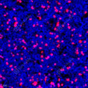 IF检测FOXP3蛋白(货号 GB11093)(红色). 样品: 大鼠胸腺, 4%多聚甲醛 (货号G1101) 固定12-24小时. 抗原修复: Tris-EDTA抗原修复液(pH 9.0) (G1203), 98℃, 20分钟. 封闭: 3% BSA(货号GC305010)的PBS溶液, 室温孵育30分钟. —抗: 1: 800稀释, 4℃ 孵育过夜. 二抗: Cy3标记山羊抗兔IgG (H+L) (货号GB21303), 1: 300稀释, 室温孵育1小时. |