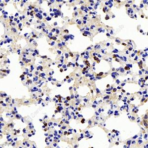 IHC检测CD63蛋白(货号 GB11620). 样品: 小鼠肺, 4%多聚甲醛 (货号G1101) 固定12-24小时. 抗原修复: 柠檬酸抗原修复液(干粉, pH 6.0) (G1201), 98℃, 20分钟. —抗: 1: 1500稀释, 4℃ 孵育过夜. 二抗: HRP标记山羊抗兔IgG (H+L) (货号GB23303), 1: 200稀释, 室温孵育1小时. |