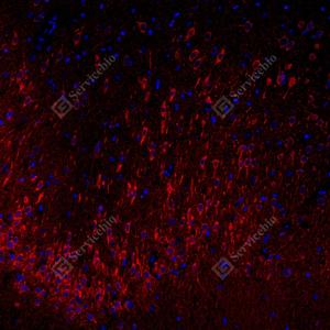 IF检测CD63蛋白(货号 GB11620)(红色). 样品: 大鼠脑, 4%多聚甲醛 (货号G1101) 固定12-24小时. 抗原修复: Tris-EDTA抗原修复液(pH 9.0) (G1203), 98℃, 20分钟. 封闭: 3% BSA(货号GC305010)的PBS溶液, 室温孵育30分钟. —抗: 1: 1500稀释, 4℃ 孵育过夜. 二抗: Cy3标记山羊抗兔IgG (H+L) (货号GB21303), 1: 300稀释, 室温孵育1小时. |