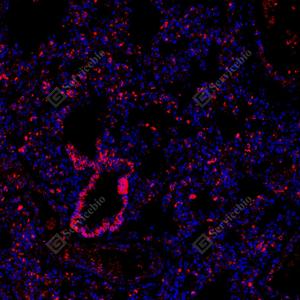 IF检测CD63蛋白(货号 GB11620)(红色). 样品: 大鼠肺, 4%多聚甲醛 (货号G1101) 固定12-24小时. 抗原修复: Tris-EDTA抗原修复液(pH 9.0) (G1203), 98℃, 20分钟. 封闭: 3% BSA(货号GC305010)的PBS溶液, 室温孵育30分钟. —抗: 1: 1500稀释, 4℃ 孵育过夜. 二抗: Cy3标记山羊抗兔IgG (H+L) (货号GB21303), 1: 300稀释, 室温孵育1小时. |