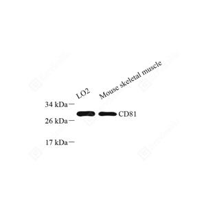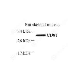 WB检测CD81蛋白(货号 GB111073). 样品: 经RIPA裂解液(货号G2002)处理的蛋白质. 封闭: 封闭: 3%脱脂牛奶(货号GC310001)溶于TBST溶液, 室温孵育1小时. —抗: 1: 500稀释, 4℃ 孵育过夜. 二抗: HRP标记山羊抗兔IgG (H+L) (货号GB23303), 1: 5000稀释, 室温孵育1小时. |