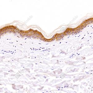 | IHC检测Claudin 1蛋白(货号 GB112543). 样品: 人皮肤, 4%多聚甲醛 (货号G1101) 固定12-24小时. 抗原修复: 柠檬酸抗原修复液(干粉, pH 6.0) (G1201), 98℃, 20分钟. —抗: 1: 1000稀释, 4℃ 孵育过夜. 二抗: HRP标记山羊抗兔IgG (H+L) (货号GB23303), 1: 200稀释, 室温孵育1小时. |