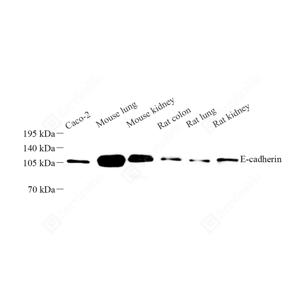 WB检测E-cadherin蛋白(货号 GB120011). 样品: 经RIPA裂解液(货号G2002)处理的蛋白质. 封闭: 3%脱脂牛奶(货号GC310001)溶于TBST溶液, 室温孵育1小时. —抗: 1: 1000稀释, 4℃ 孵育过夜. 二抗: HRP标记山羊抗小鼠IgG (H+L) (货号GB23301), 1: 5000稀释, 室温孵育1小时. |