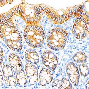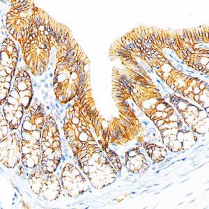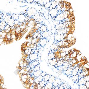 IHC检测E-cadherin蛋白(货号 GB120011). 样品: 大鼠结肠, 4%多聚甲醛 (货号G1101) 固定12-24小时. 抗原修复: 柠檬酸抗原修复液(干粉, pH 6.0) (G1201), 98℃, 20分钟. —抗: 1: 500稀释, 4℃ 孵育过夜. 二抗: S-vision免疫组化多聚二抗(山羊抗小鼠), 即用型(货号G1301), 室温孵育20分钟. |