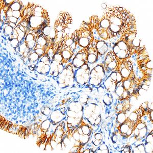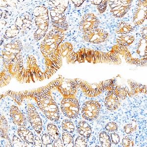 IHC检测E-cadherin蛋白(货号 GB120011). 样品: 小鼠结肠, 4%多聚甲醛 (货号G1101) 固定12-24小时. 抗原修复: 柠檬酸抗原修复液(干粉, pH 6.0) (G1201), 98℃, 20分钟. —抗: 1: 500稀释, 4℃ 孵育过夜. 二抗: S-vision免疫组化多聚二抗(山羊抗小鼠), 即用型(货号G1301), 室温孵育20分钟. |