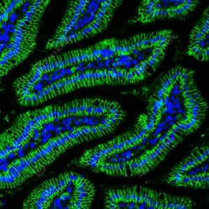 IF检测E-cadherin蛋白(货号 GB120011)(绿色). 样品: 小鼠小肠, 4%多聚甲醛 (货号G1101) 固定12-24小时. 抗原修复: Tris-EDTA抗原修复液(pH 9.0) (G1203), 98℃, 20分钟. 封闭: 3% BSA(货号GC305010)的PBS溶液, 室温孵育30分钟. —抗: 1: 300稀释, 4℃ 孵育过夜. 二抗: Alexa Fluor 488标记山羊抗小鼠IgG (H+L) (货号GB25301), 1: 400稀释, 室温孵育1小时. |
