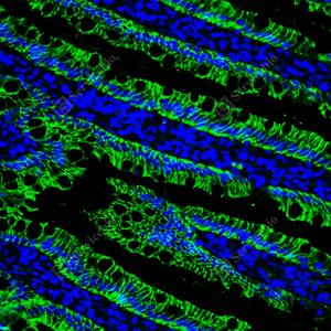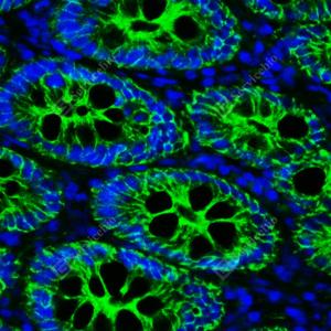 IF检测E-cadherin蛋白(货号 GB120011)(绿色). 样品: 大鼠小肠, 4%多聚甲醛 (货号G1101) 固定12-24小时. 抗原修复: Tris-EDTA抗原修复液(pH 9.0) (G1203), 98℃, 20分钟. 封闭: 3% BSA(货号GC305010)的PBS溶液, 室温孵育30分钟. —抗: 1: 300稀释, 4℃ 孵育过夜. 二抗: Alexa Fluor 488标记山羊抗小鼠IgG (H+L) (货号GB25301), 1: 400稀释, 室温孵育1小时. |