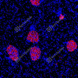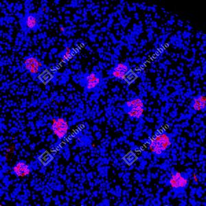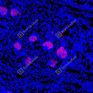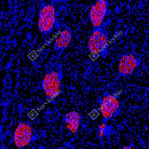 | IF检测Nephrin蛋白(货号 GB155655)(红色). 样品: 大鼠肾, 4%多聚甲醛 (货号G1101) 固定12-24小时. 抗原修复: 抗原修复仪 (货号 ARI-4),Tris-EDTA抗原修复液(pH 9.0) (货号G1203), 水浴100℃, 25分钟. 封闭: 3% BSA(货号GC305010)的PBS溶液, 室温孵育30分钟. —抗: 1: 1000稀释, 4℃ 孵育过夜. 二抗: Cy3标记山羊抗小鼠IgG (H+L) (货号GB21301), 1: 300稀释, 室温孵育1小时. |