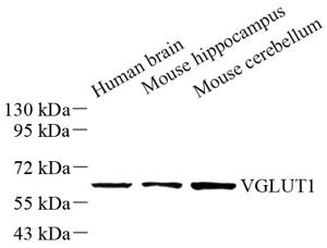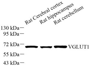 WB检测VGluT1蛋白(货号 GB11821). 样品: 经RIPA裂解液(货号G2002)处理的蛋白质. 封闭: 3%脱脂牛奶(货号GC310001)溶于TBST溶液, 室温孵育1小时. —抗: 1: 500稀释, 4℃ 孵育过夜. 二抗: HRP标记山羊抗兔IgG (H+L) (货号GB23303), 1: 5000稀释, 室温孵育1小时. |