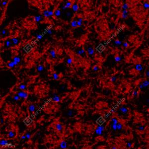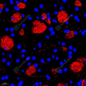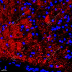 IF检测VGluT1蛋白(货号 GB11821)(红色). 样品: 小鼠小脑, 4%多聚甲醛 (货号G1101) 固定12-24小时. 抗原修复: Tris-EDTA抗原修复液(pH 9.0) (G1203), 98℃, 20分钟. 封闭: 3% BSA(货号GC305010)的PBS溶液, 室温孵育30分钟. —抗: 1: 1000稀释, 4℃ 孵育过夜. 二抗: Cy3标记山羊抗兔IgG (H+L) (货号GB21303), 1: 300稀释, 室温孵育1小时. |