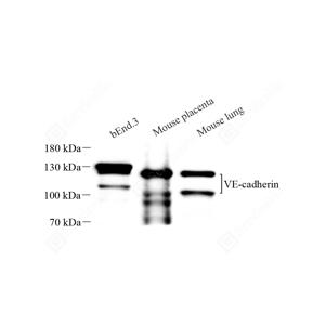 WB检测VE Cadherin蛋白(货号 GB12013). 样品: 经RIPA裂解液(货号G2002)处理的蛋白质. 封闭: 封闭: 3%脱脂牛奶(货号GC310001)溶于TBST溶液, 室温孵育1小时. —抗: 1: 1000稀释, 4℃ 孵育过夜. 二抗: HRP标记山羊抗小鼠IgG (H+L) (货号GB23301), 1: 5000稀释, 室温孵育1小时. |