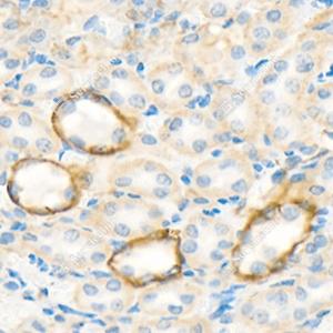 IHC检测Junctional Adhesion Molecule 1/JAM-A蛋白(货号 GB111265). 样品: 大鼠肾, 4%多聚甲醛 (货号G1101) 固定12-24小时. 抗原修复: 柠檬酸抗原修复液(干粉, pH 6.0) (G1201), 98℃, 20分钟. —抗: 1: 1500稀释, 4℃ 孵育过夜. 二抗: HRP标记山羊抗兔IgG (H+L) (货号GB23303), 1: 200稀释, 室温孵育1小时. |