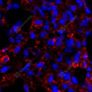 IF检测Junctional Adhesion Molecule 1/JAM-A蛋白(货号 GB111265)(红色). 样品: 大鼠肺, 4%多聚甲醛 (货号G1101) 固定12-24小时. 抗原修复: Tris-EDTA抗原修复液(pH 9.0) (G1203), 98℃, 20分钟. 封闭: 3% BSA(货号GC305010)的PBS溶液, 室温孵育30分钟. —抗: 1: 1500稀释, 4℃ 孵育过夜. 二抗: Cy3标记山羊抗兔IgG (H+L) (货号GB21303), 1: 300稀释, 室温孵育1小时. |