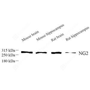 WB检测NG2蛋白(货号 GB111915). 样品: 经RIPA裂解液(货号G2002)处理的蛋白质. 封闭: 封闭: 3%脱脂牛奶(货号GC310001)溶于TBST溶液, 室温孵育1小时. —抗: 1: 300稀释, 4℃ 孵育过夜. 二抗: HRP标记山羊抗兔IgG (H+L) (货号GB23303), 1: 5000稀释, 室温孵育1小时. |