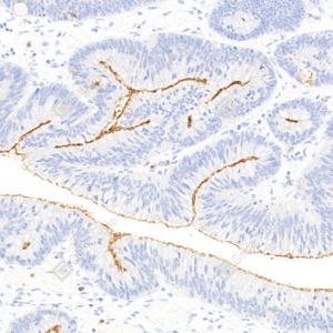 IHC检测CEACAM1蛋白(货号 GB122292). 样品: 人结肠, 4%多聚甲醛 (货号G1101) 固定12-24小时. 抗原修复: 柠檬酸抗原修复液(干粉, pH 6.0) (G1201), 高压锅均匀喷气计时2分钟. —抗: 1: 1000稀释, 4℃ 孵育过夜. 二抗: HRP标记山羊抗小鼠IgG (H+L) (货号GB23301), 1: 200稀释, 室温孵育1小时. |