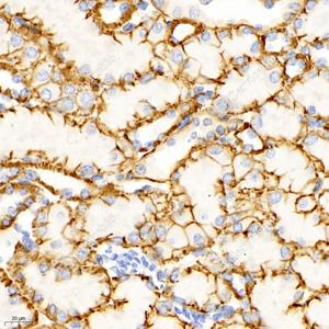 IHC检测Cadherin 16蛋白(货号 GB12935). 样品: 大鼠肾, 4%多聚甲醛 (货号G1101) 固定12-24小时. 抗原修复: 柠檬酸抗原修复液(干粉, pH 6.0) (G1201), 高压锅均匀喷气计时2分钟. —抗: 1: 2000稀释, 4℃ 孵育过夜. 二抗: HRP标记山羊抗小鼠IgG (H+L) (货号GB23301), 1: 200稀释, 室温孵育1小时. |