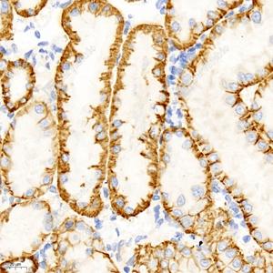 IHC检测Cadherin 16蛋白(货号 GB12935). 样品: 人肾, 4%多聚甲醛 (货号G1101) 固定12-24小时. 抗原修复: 柠檬酸抗原修复液(干粉, pH 6.0) (G1201), 高压锅均匀喷气计时2分钟. —抗: 1: 2000稀释, 4℃ 孵育过夜. 二抗: HRP标记山羊抗小鼠IgG (H+L) (货号GB23301), 1: 200稀释, 室温孵育1小时. |