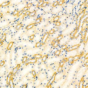 IHC检测Cadherin 16蛋白(货号 GB11953). 样品: 小鼠肾, 4%多聚甲醛 (货号G1101) 固定12-24小时. 抗原修复: 柠檬酸抗原修复液(干粉, pH 6.0) (G1201), 98℃, 20分钟. —抗: 1: 1500稀释, 4℃ 孵育过夜. 二抗: HRP标记山羊抗兔IgG (H+L) (货号GB23303), 1: 200稀释, 室温孵育1小时. |
