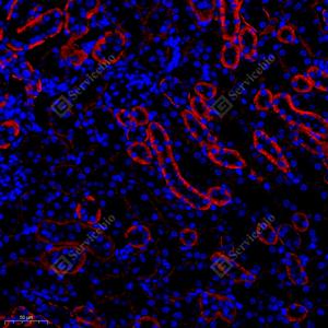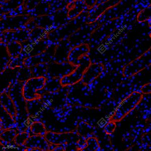 IF检测Cadherin 16蛋白(货号 GB11953)(红色). 样品: 小鼠肾炎, 4%多聚甲醛 (货号G1101) 固定12-24小时. 抗原修复: Tris-EDTA抗原修复液(pH 9.0) (G1203), 98℃, 20分钟. 封闭: 3% BSA(货号GC305010)的PBS溶液, 室温孵育30分钟. —抗: 1: 1500稀释, 4℃ 孵育过夜. 二抗: Cy3标记山羊抗兔IgG (H+L) (货号GB21303), 1: 300稀释, 室温孵育1小时. |