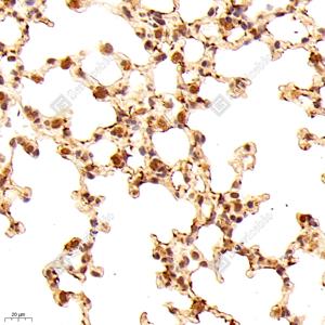 | IHC检测SFTPA1蛋白(货号 GB114165). 样品: 大鼠肺, 4%多聚甲醛 (货号G1101) 固定12-24小时. 抗原修复: 柠檬酸抗原修复液(干粉, pH 6.0) (G1201), 98℃, 20分钟. —抗: 1: 1000稀释, 4℃ 孵育过夜. 二抗: HRP标记山羊抗兔IgG (H+L) (货号GB23303), 1: 200稀释, 室温孵育1小时. |