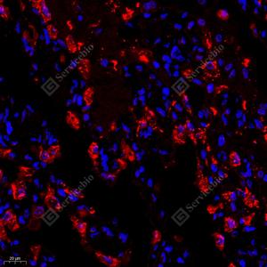 | IF检测SFTPA1蛋白(货号 GB114165)(红色). 样品: 人肺癌, 4%多聚甲醛 (货号G1101) 固定12-24小时. 抗原修复: Tris-EDTA抗原修复液(pH 9.0) (G1203), 98℃, 20分钟. 封闭: 3% BSA(货号GC305010)的PBS溶液, 室温孵育30分钟. —抗: 1: 1000稀释, 4℃ 孵育过夜. 二抗: Cy3标记山羊抗兔IgG (H+L) (货号GB21303), 1: 300稀释, 室温孵育1小时. |