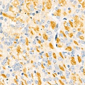 IHC检测L1CAM蛋白(货号 GB112046). 样品: 大鼠黑质, 4%多聚甲醛 (货号G1101) 固定12-24小时. 抗原修复: 柠檬酸抗原修复液(干粉, pH 6.0) (G1201), 98℃, 20分钟. —抗: 1: 800稀释, 4℃ 孵育过夜. 二抗: HRP标记山羊抗兔IgG (H+L) (货号GB23303), 1: 200稀释, 室温孵育1小时. |