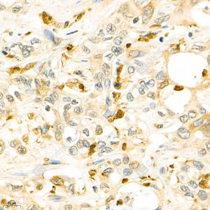 IHC检测Annexin A3/ANXA3蛋白(货号 GB112378). 样品: 人子宫癌, 4%多聚甲醛 (货号G1101) 固定12-24小时. 抗原修复: 柠檬酸抗原修复液(干粉, pH 6.0) (G1201), 98℃, 20分钟. —抗: 1: 200稀释, 4℃ 孵育过夜. 二抗: HRP标记山羊抗兔IgG (H+L) (货号GB23303), 1: 200稀释, 室温孵育1小时. |