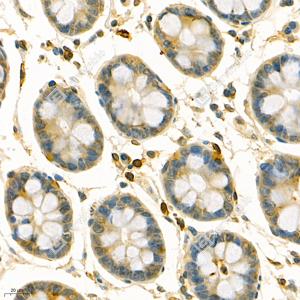 IHC检测Annexin A3/ANXA3蛋白(货号 GB112378). 样品: 人结肠, 4%多聚甲醛 (货号G1101) 固定12-24小时. 抗原修复: 柠檬酸抗原修复液(干粉, pH 6.0) (G1201), 98℃, 20分钟. —抗: 1: 200稀释, 4℃ 孵育过夜. 二抗: HRP标记山羊抗兔IgG (H+L) (货号GB23303), 1: 200稀释, 室温孵育1小时. |