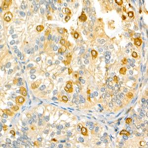 IHC检测Annexin A3/ANXA3蛋白(货号 GB112378). 样品: 人胆管癌, 4%多聚甲醛 (货号G1101) 固定12-24小时. 抗原修复: 柠檬酸抗原修复液(干粉, pH 6.0) (G1201), 98℃, 20分钟. —抗: 1: 200稀释, 4℃ 孵育过夜. 二抗: HRP标记山羊抗兔IgG (H+L) (货号GB23303), 1: 200稀释, 室温孵育1小时. |