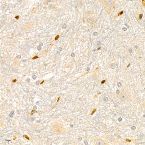 IHC检测Annexin A3/ANXA3蛋白(货号 GB112378). 样品: 小鼠脊髓, 4%多聚甲醛 (货号G1101) 固定12-24小时. 抗原修复: 柠檬酸抗原修复液(干粉, pH 6.0) (G1201), 98℃, 20分钟. —抗: 1: 200稀释, 4℃ 孵育过夜. 二抗: HRP标记山羊抗兔IgG (H+L) (货号GB23303), 1: 200稀释, 室温孵育1小时. |
