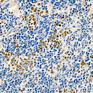 IHC检测Annexin A3/ANXA3蛋白(货号 GB112378). 样品: 小鼠脾, 4%多聚甲醛 (货号G1101) 固定12-24小时. 抗原修复: 柠檬酸抗原修复液(干粉, pH 6.0) (G1201), 98℃, 20分钟. —抗: 1: 200稀释, 4℃ 孵育过夜. 二抗: HRP标记山羊抗兔IgG (H+L) (货号GB23303), 1: 200稀释, 室温孵育1小时. |