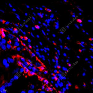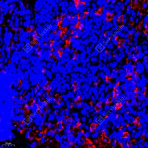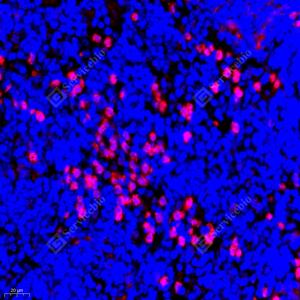 IF检测Annexin A3/ANXA3蛋白(货号 GB112378)(红色). 样品: 小鼠脾, 4%多聚甲醛 (货号G1101) 固定12-24小时. 抗原修复: Tris-EDTA抗原修复液(pH 9.0) (G1203), 98℃, 20分钟. 封闭: 3% BSA(货号GC305010)的PBS溶液, 室温孵育30分钟. —抗: 1: 300稀释, 4℃ 孵育过夜. 二抗: Cy3标记山羊抗兔IgG (H+L) (货号GB21303), 1: 300稀释, 室温孵育1小时. |