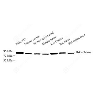 WB检测H Cadherin蛋白(货号 GB11996). 样品: 经RIPA裂解液(货号G2002)处理的蛋白质. 封闭: 封闭: 3%脱脂牛奶(货号GC310001)溶于TBST溶液, 室温孵育1小时. —抗: 1: 500稀释, 4℃ 孵育过夜. 二抗: HRP标记山羊抗兔IgG (H+L) (货号GB23303), 1: 5000稀释, 室温孵育1小时. |