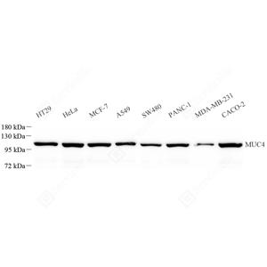 WB检测MUC4蛋白(货号 GB11895). 样品: 经RIPA裂解液(货号G2002)处理的蛋白质. 封闭: 封闭: 3%脱脂牛奶(货号GC310001)溶于TBST溶液, 室温孵育1小时. —抗: 1: 500稀释, 4℃ 孵育过夜. 二抗: HRP标记山羊抗兔IgG (H+L) (货号GB23303), 1: 5000稀释, 室温孵育1小时. |