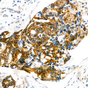 IHC检测LI Cadherin蛋白(货号 GB111125). 样品: 人肺癌, 4%多聚甲醛 (货号G1101) 固定12-24小时. 抗原修复: 柠檬酸抗原修复液(干粉, pH 6.0) (G1201), 98℃, 20分钟. —抗: 1: 1600稀释, 4℃ 孵育过夜. 二抗: HRP标记山羊抗兔IgG (H+L) (货号GB23303), 1: 200稀释, 室温孵育1小时. |