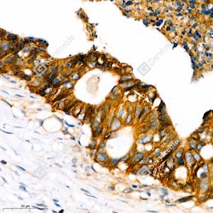 IHC检测LI Cadherin蛋白(货号 GB111125). 样品: 人胃癌, 4%多聚甲醛 (货号G1101) 固定12-24小时. 抗原修复: 柠檬酸抗原修复液(干粉, pH 6.0) (G1201), 98℃, 20分钟. —抗: 1: 1500稀释, 4℃ 孵育过夜. 二抗: HRP标记山羊抗兔IgG (H+L) (货号GB23303), 1: 200稀释, 室温孵育1小时. |
