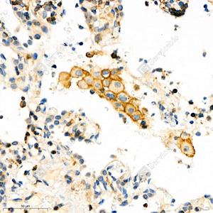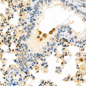 IHC检测LI Cadherin蛋白(货号 GB111125). 样品: 小鼠肺, 4%多聚甲醛 (货号G1101) 固定12-24小时. 抗原修复: 柠檬酸抗原修复液(干粉, pH 6.0) (G1201), 98℃, 20分钟. —抗: 1: 1600稀释, 4℃ 孵育过夜. 二抗: HRP标记山羊抗兔IgG (H+L) (货号GB23303), 1: 200稀释, 室温孵育1小时. |