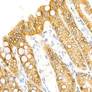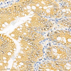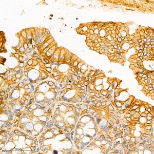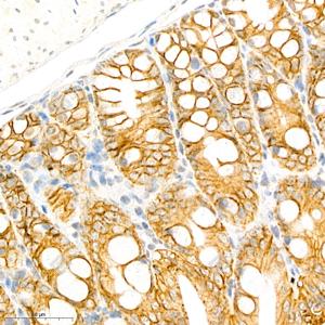 IHC检测LI Cadherin蛋白(货号 GB111125). 样品: 小鼠结肠, 4%多聚甲醛 (货号G1101) 固定12-24小时. 抗原修复: 柠檬酸抗原修复液(干粉, pH 6.0) (G1201), 98℃, 20分钟. —抗: 1: 1500稀释, 4℃ 孵育过夜. 二抗: HRP标记山羊抗兔IgG (H+L) (货号GB23303), 1: 200稀释, 室温孵育1小时. |