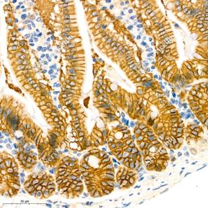 IHC检测LI Cadherin蛋白(货号 GB111125). 样品: 小鼠小肠, 4%多聚甲醛 (货号G1101) 固定12-24小时. 抗原修复: 柠檬酸抗原修复液(干粉, pH 6.0) (G1201), 98℃, 20分钟. —抗: 1: 1600稀释, 4℃ 孵育过夜. 二抗: HRP标记山羊抗兔IgG (H+L) (货号GB23303), 1: 200稀释, 室温孵育1小时. |