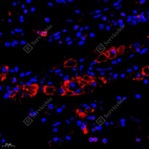 IF检测LI Cadherin蛋白(货号 GB111125)(红色). 样品: 大鼠脾, 4%多聚甲醛 (货号G1101) 固定12-24小时. 抗原修复: Tris-EDTA抗原修复液(pH 9.0) (G1203), 98℃, 20分钟. 封闭: 3% BSA(货号GC305010)的PBS溶液, 室温孵育30分钟. —抗: 1: 1600稀释, 4℃ 孵育过夜. 二抗: Cy3标记山羊抗兔IgG (H+L) (货号GB21303), 1: 300稀释, 室温孵育1小时. |