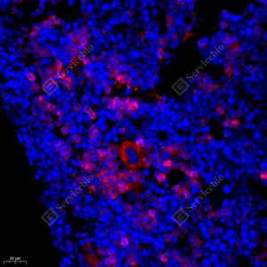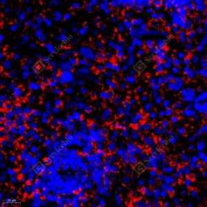 IF检测LI Cadherin蛋白(货号 GB111125)(红色). 样品: 大鼠脾, 4%多聚甲醛 (货号G1101) 固定12-24小时. 抗原修复: Tris-EDTA抗原修复液(pH 9.0) (G1203), 98℃, 20分钟. 封闭: 3% BSA(货号GC305010)的PBS溶液, 室温孵育30分钟. —抗: 1: 2000稀释, 4℃ 孵育过夜. 二抗: Cy3标记山羊抗兔IgG (H+L) (货号GB21303), 1: 300稀释, 室温孵育1小时. |