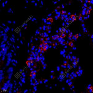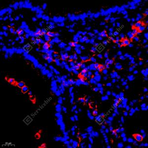IF检测LI Cadherin蛋白(货号 GB111125)(红色). 样品: 小鼠肺, 4%多聚甲醛 (货号G1101) 固定12-24小时. 抗原修复: Tris-EDTA抗原修复液(pH 9.0) (G1203), 98℃, 20分钟. 封闭: 3% BSA(货号GC305010)的PBS溶液, 室温孵育30分钟. —抗: 1: 1600稀释, 4℃ 孵育过夜. 二抗: Cy3标记山羊抗兔IgG (H+L) (货号GB21303), 1: 300稀释, 室温孵育1小时. |