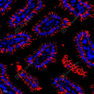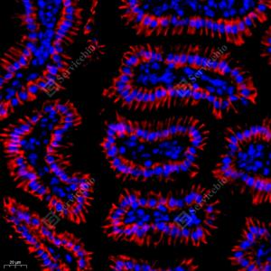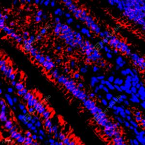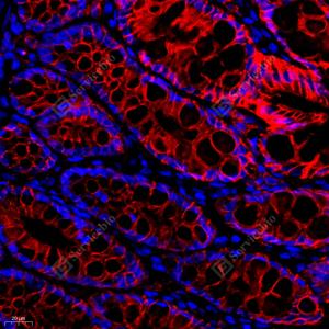 IF检测LI Cadherin蛋白(货号 GB111125)(红色). 样品: 小鼠小肠, 4%多聚甲醛 (货号G1101) 固定12-24小时. 抗原修复: Tris-EDTA抗原修复液(pH 9.0) (G1203), 98℃, 20分钟. 封闭: 3% BSA(货号GC305010)的PBS溶液, 室温孵育30分钟. —抗: 1: 2000稀释, 4℃ 孵育过夜. 二抗: Cy3标记山羊抗兔IgG (H+L) (货号GB21303), 1: 300稀释, 室温孵育1小时. |